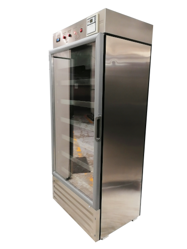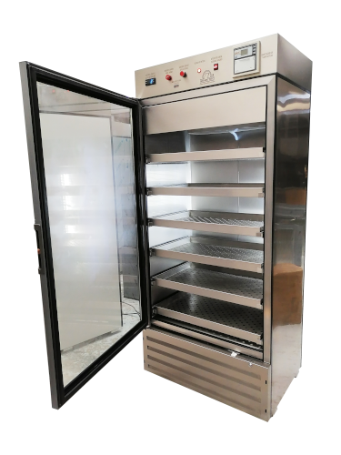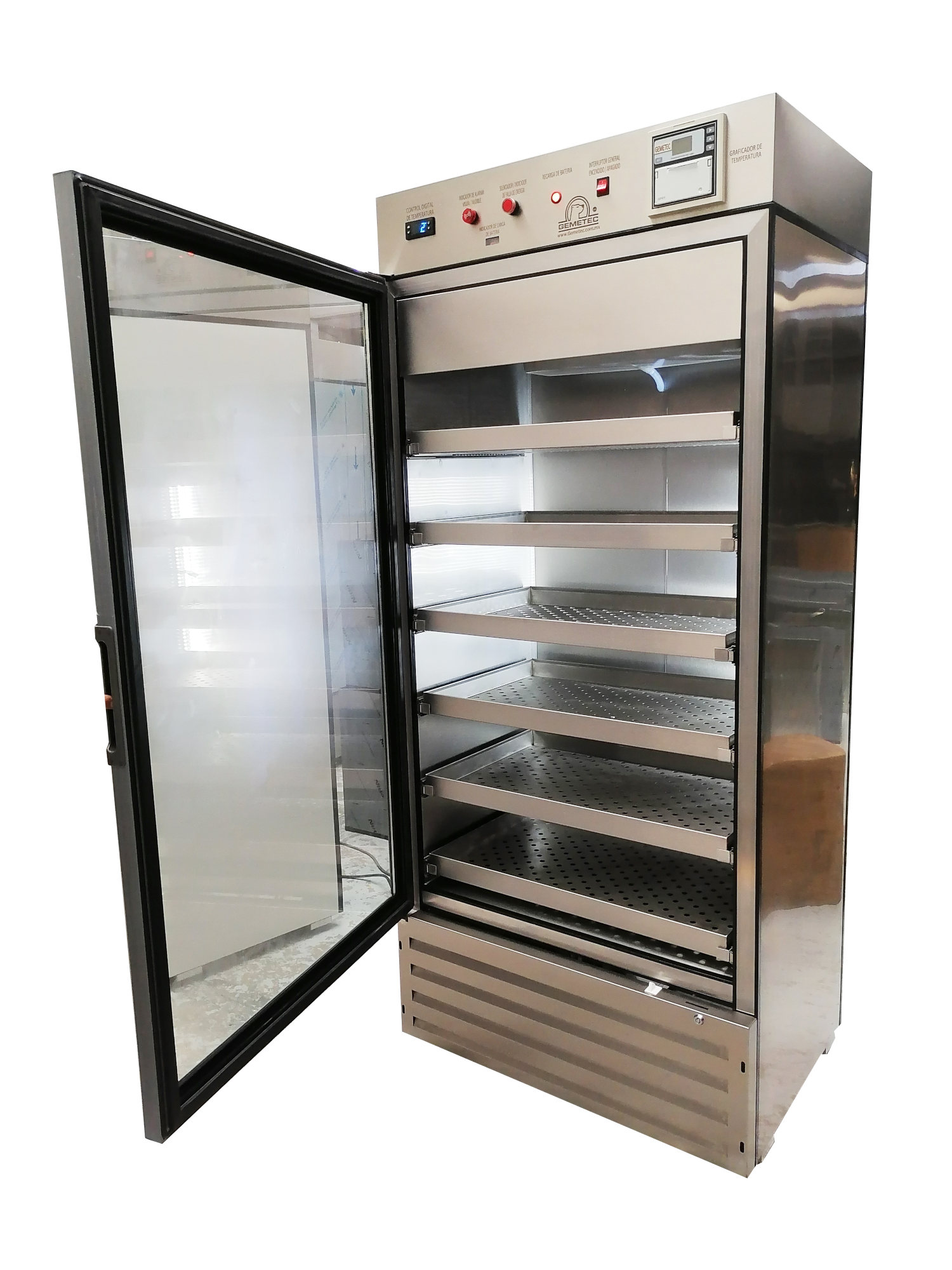 Gabinete interior-exterior fabricado en acero inoxidable tipo AISI-304 Sanitario con esperor de 4.5 cm.Puerta con doble panel de vidrio.Charolas deslizables en acero inoxidable tipo AISI-304.Acabados en interiores y exteriores sin partes filosas, rebabas, sobrantes o faltantes de material en: gabinete, puerta, canastillas o charolas y en las parrillas.